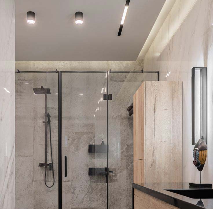 Трекові світильники — це гнучке та універсальне рішення для підсвітки дзеркала у ванній, яке дозволяє змінювати напрямок світла за потребою. Їх встановлюють на рейку над дзеркалом або на стелі, а самі світильники можуть повертатися та нахилятися, щоб точно висвітлити потрібну зону. Такий тип світильників підходить для сучасних інтер’єрів, де важливо поєднувати функціональність і стиль, а також регулювати яскравість і кут світіння під різні завдання.